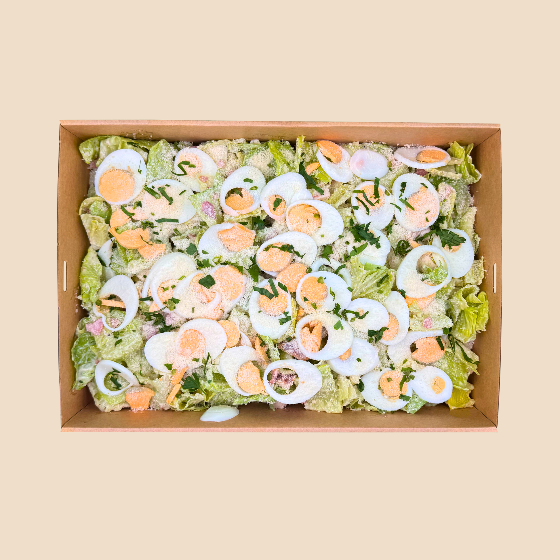 Crispy Cos Lettuce generously dressed in Caesar Dressing topped with Grilled & Marinated Chicken Breast, Bacon & sliced Boiled Egg, topped with Parmesan Cheese